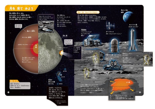 ▲月の中身やクレーターのひみつのほか、月面基地のイメージも紹介!