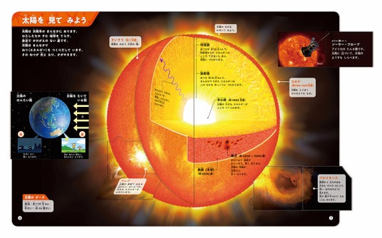 しかけをめくると、太陽や月、地球などの天体の断面が見られたり、ロケットや宇宙服の構造が一目でわかったりします。
