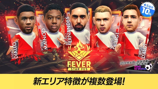 「ブルーノ・フェルナンデス」「コビー・メイヌー」「マタイス・デ・リフト」「アマド・ディアロ」「ディオゴ・ダロト」といったイングランド強豪クラブの現役選手たちが、得意戦術サイドアタックの新★5選手として登場する“FEVER STAR FES”を開催! あわせて★4バージョンの選手たちがもらえる“スペシャルログインボーナス”も実施します。