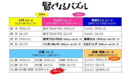 『賢くなるパズル』は、パズルの内容にあわせた5つのシリーズに分けられています。このたび、新刊4冊が加わり、全22冊となりました。豊富なラインナップで、興味やレベルにあわせて選ぶことができます。