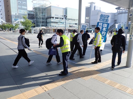 JAFでは自動車ユーザーの団体として、不合理な仕組みの廃止や見直しを主な論点として活動を展開しております。今回はJR高松駅前広場において、香川支部と各参加団体がのぼりを立てて通学・通勤の皆様に自動車税制の問題点や改正の必要性を広報物配布により啓発いたします。