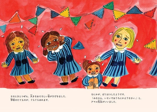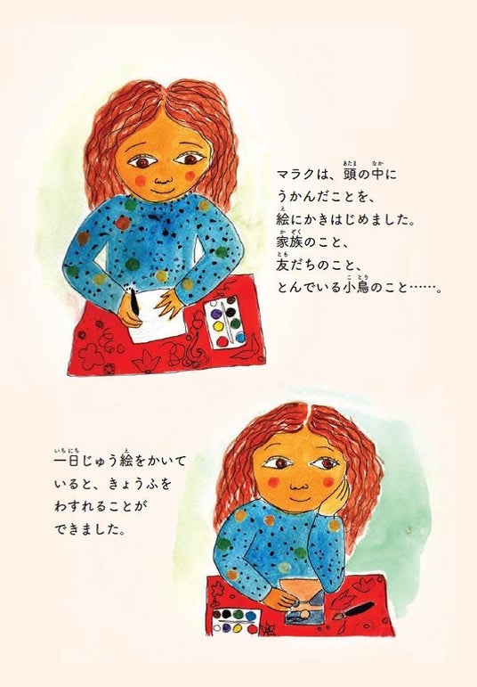 マラクさんは注目の若手アーティストとして精力的に作品を発表していますが、今回の絵本のタッチはそれとは違い、まるで子どもが描いたかのようです。「私の中の子どもに、生の感情のまま、自由に描いてもらいました」と彼女は語っています。