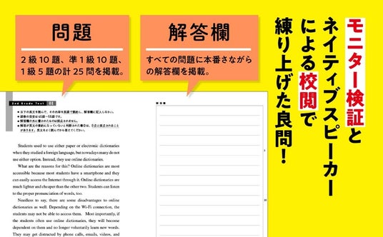 問題はGakken編集部が、過去に英検で出題されてきた英文を分析し選び出した「よく出るテーマ」のオリジナル英文を作成。その後、モニター受験や複数のネイティブスピーカーによる校閲により練り上げました。2級レベルの英文を10題、準1級レベルの英文を10題、1級レベルの英文を5題の合計25題を収録した充実の問題集です。問題編は別冊としてついており、本体から取り外して使えます。また、すべての問題には解答欄も付いています。