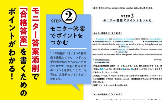 「STEP2」では、モニター受験で問題を解いてくれた受験者の回答例の添削を通して、内容的、文法的に受験者が陥りやすいミスのポイントを紹介します。各問題につき2つの回答例の添削を掲載し、くわしいコメントをつけています。