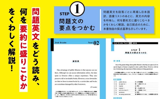 「要約問題」が出題されるのは1級、準1級、2級の3つの級です。それぞれ英文の難易度や長さが違いますが、「英文を正確に読み、要点をつかむ→要点を正確な英語で作文する→語数制限内の英語にまとめる」という基本的なプロセスに違いはありません。本書ではこの基本的なプロセスを2級レベルのやさしい問題からはじめて、準1級、1級へとステップアップできる構成にしています。