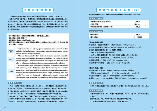 本体の冒頭では、級ごとの問題の全体像と、本書で採用している採点基準をくわしく解説しています。「採点基準」は本書独自のもので、読者が自分の答案を自己採点したあと、観点に沿って復習ができるように、本番よりも細かに竹岡先生が設定したものです。公益財団法人 日本英語検定協会が発表しているものではありません。
