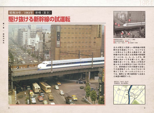 本書では昭和30年代を第1章とし、昭和40年代を第2章、昭和50年代を第3章とする3章構成に。まず、昭和30年代では第二次大戦の終戦からわずか19年で東京オリンピックが開催され、「走るホテル」とも言われたブルートレイン、200km/h以上の超高速で走り抜ける新幹線が登場し、五輪開催に合わせて地下鉄やモノレールなど乗り物の新勢力が台頭するなど、街並みが大きく変わった時代でありました。