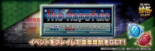 ランキングイベント“The Hopefuls ─秩序と混沌をもたらす救世主─”では、期間中に『真・女神転生』の雰囲気が味わえるイベントオリジナルのストーリーを楽しめるほか、イベント専用のミッションをクリアすることで、「潜在烙印片★6」を獲得できます。また、イベントクエスト等で手に入る「秩序と混沌の硬貨」を集めることで、「ロウヒーローの超越石」や「カオスヒーローの超越石」、「縁祭記念召喚札」などの豪華報酬を獲得できます。さらに、ランキング報酬では、イベント限定のスキル因子を獲得できます。