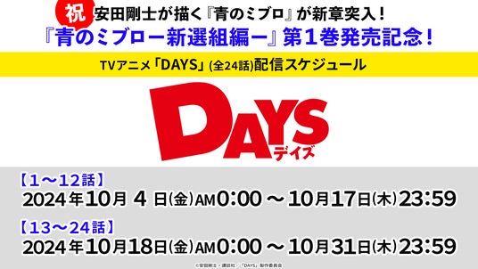 週刊少年マガジン連載の安田剛士先生の「青のミブロ」が涙の第一部完結!そして新章の第二部「新選組編」が連載開始となり、「青のミブロー新選組編ー」最新第1巻が9月17日より大好評発売中です。これを記念して、講談社が運営するYouTubeチャンネル「フル☆アニメTV」にて、TVアニメ「DAYS」全24話を無料配信いたします。【第1話~第12話】を本日10月4日から10月17日まで、【第13話~第24話】を10月18日から10月31日までの期間限定配信となりますので、最新作「青のミブロー新選組編ー」と一緒にぜひお楽しみください!