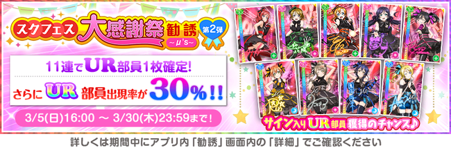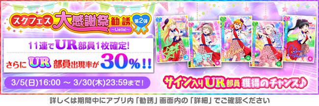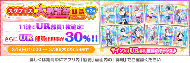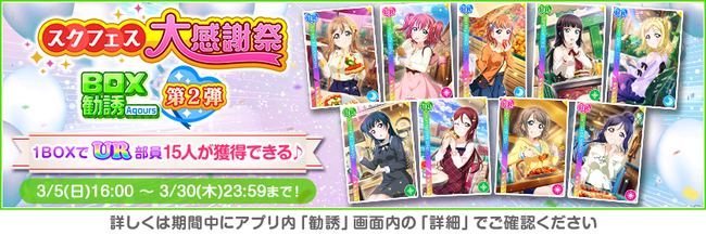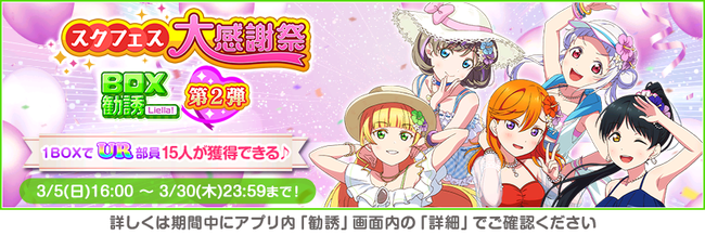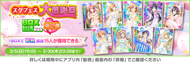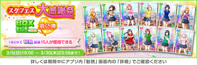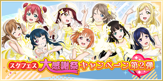 株式会社ブシロード(本社:東京都中野区、代表取締役社長:木谷高明)は、KLab株式会社(本社:東京都港区、代表取締役社長:森田英克)と共同開発いたしましたスマートフォン向けアプリ『ラブライブ!スクールアイドルフェスティバル』(以下、スクフェス) においてスクフェス大感謝祭キャンペーン第2弾の開催をお知らせいたします。