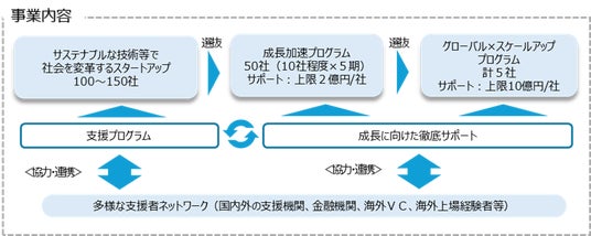 - さらに、SusHi Tech Global Startupsの中から、グローバルな成長につながる取組を募り、「成長加速プログラム」として1件当たり上限2億円の資金サポートとオーダーメイド型の伴走支援を実施します。