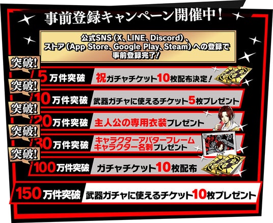 事前登録件数が150万件を突破すると、正式サービス開始後に「武器ガチャに使えるチケット10枚」を現在の報酬に追加でプレゼントします。事前登録キャンペーンへの参加は、各プラットフォームのほか、各SNSへのフォローなどでも受付中です。