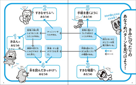 ▲『必ず書ける あなうめ読書感想文 改訂版』巻頭についている診断チャート。「はい」か「いいえ」を選んで進んでいくと、自分に合ったあなうめパターンがわかる。