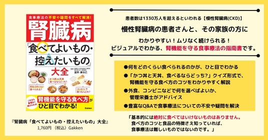 株式会社 学研ホールディングス(東京・品川/代表取締役社長:宮原博昭)のグループ会社、株式会社 Gakken(東京・品川/代表取締役社長:五郎丸徹)は、2024年8月29日(木)に『腎臓病「食べてよいもの・控えたいもの」大全』(監修:富野康日己)を発売いたしました。