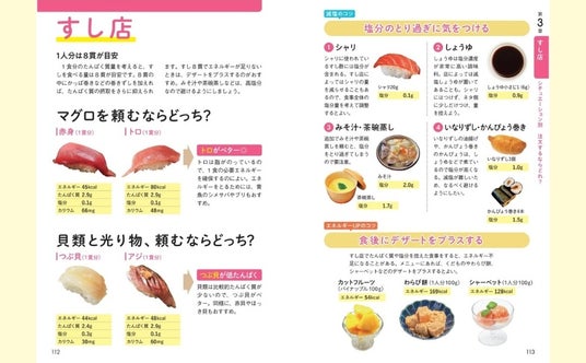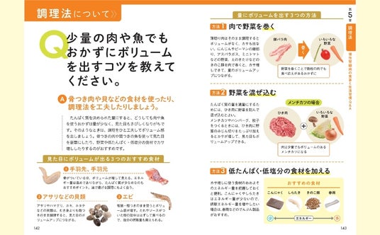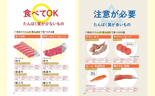 ▲食べる機会が多い2つのメニューをくらべて、腎臓に負担をかけないメニュー選びのポイントを紹介。食べる量や栄養成分を調整する方法も解説しているので、外食先でメニューを選ぶときや献立をたてるときの手助けになります。