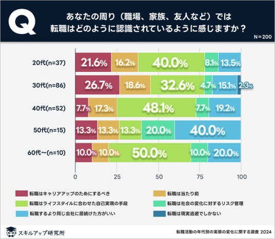「あなたの周り(職場、家族、友人など)では転職はどのように認識されているように感じますか?」という質問に対し、20~40代では「転職はライフスタイルに合わせた自己実現の手段」と認識されているという回答が最も多かった。
