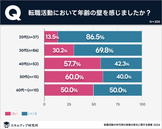 「転職活動において年齢の壁を感じましたか?」という質問に対し、40代以降では半分以上が「転職時に年齢で壁を感じる」と回答する結果となった。