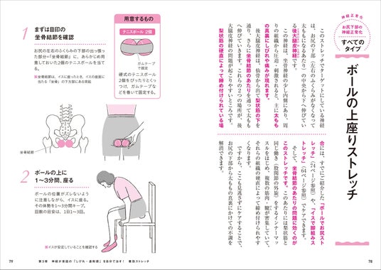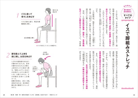 家や職場で簡単、楽に実践できる! 坐骨神経痛によるつらい痛みに効果的な「特効ストレッチ」や、しびれや違和感を解消する「著効セルフケア」を、イラストを多用しながら、どこよりもわかりやすく解説