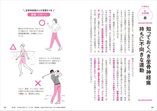 「立つとき」のベストな姿勢/脊柱管狭窄症からくるしびれには「腕組み」が効く/「イスに潜む危険」に要注意/「床に座るとき」のベストな姿勢/歩行中にできる坐骨神経痛対策/「寝るとき」のベストな姿勢/「お風呂とカイロ」でしびれ・痛みを抑制/知っておくべき坐骨神経痛持ちに不向きな運動/自転車によく乗る人は「サドル」に気を配る