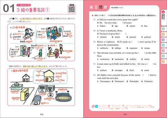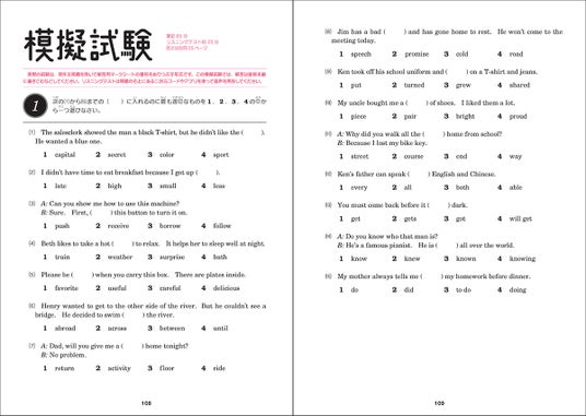 右ページは練習問題。英検の出題傾向を分析したオリジナルの予想問題を解くことで、左ページで学習したポイントを確認しながら、実際の英検問題に通用する実戦力を身につけることができます。