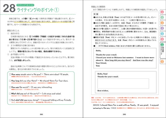 3級、準2級ではライティングに新しく加わった「Eメール問題」について、左ページでポイントを押さえた上で、右ページで練習問題を解くというシリーズの特長を活かしたスモールステップで展開。