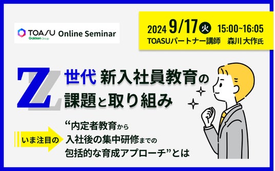 株式会社 学研ホールディングス(東京・品川/代表取締役社長:宮原博昭)のグループ会社、株式会社TOASU(東京・品川/代表取締役社長:宮田 晃)は、2024年9月17日(火)に、「Z世代新入社員教育の課題と取り組み いま注目の“内定者教育から入社後の集中研修までの包括的な育成アプローチ”とは」を実施いたします。