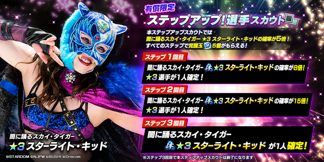新日SSは2023年4月12日(水)メンテナンス終了後から、スターダムより新規育成選手として、★3「[闇に踊るスカイ・タイガー]スターライト・キッド」が登場する「STARDOM限定!ステップアップ!選手スカウト」を開催しています。