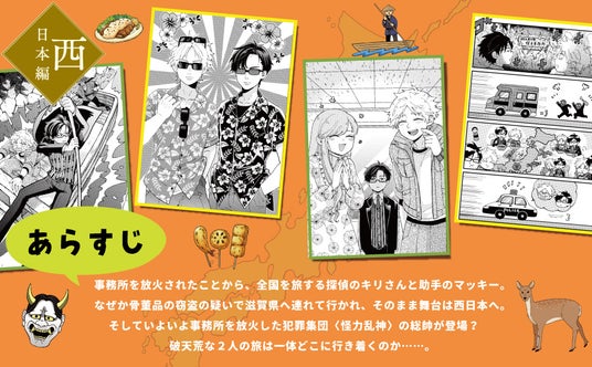 岐阜県まで旅を続けたキリさんとマッキーは、なぜか滋賀県で発生した骨董品窃盗の疑いをかけられてしまう。自分たちの身の潔白を証明し、真相を究明するため、舞台は西日本へ。相変わらず各地のおいしいものを食べながら旅を続けるふたりの前に、ついに事務所を放火した犯罪組織〈怪力乱神〉の総帥が姿を現す。沖縄で彼らにとらわれたふたりは、無事に脱出できるのか……?