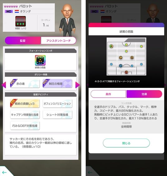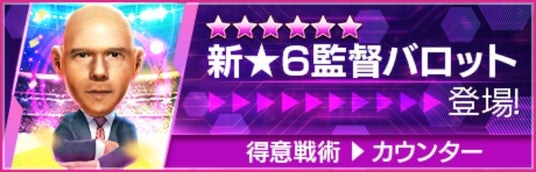 該当の選手を編成すると強くなるフォーメーションコンボ「緋翼の君臨」と戦術得意度Lv10を持つ新★6監督「バロット」が登場! また、新★6監督「バロット」は、発動したキャプテン特徴の効果量が2倍になる「キャプテン特徴強化指導」と、相手チーム全員のシュートが極大ダウンする「シュート対策指導」を持ち、さらにマークスキル発動率、ショートパス発動率、守備意識を中アップするポリシー特徴「赤の魂」を所持しています。