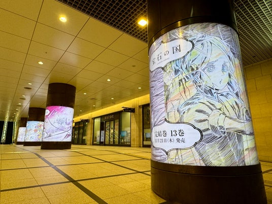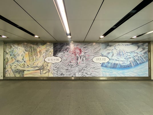 それから数か月に渡って準備を重ね、いよいよ2024年11月21日(木)、コミックス最終13巻の発売を迎えます。これを記念して、2024年11月18日(月)以降、渋谷駅(東京都)、大阪梅田駅(大阪府)、講談社社屋の3か所で、大型広告を掲出いたします。イラストは『宝石の国』の物語を振り返る内容となっており、著者がこの広告のために色鉛筆で描き下ろしました。