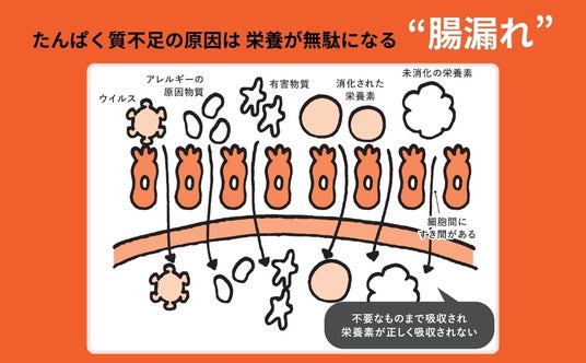 腸粘膜の細胞に炎症が起こると、腸粘膜の細胞と細胞の間に「すきま」ができてしまいます。そのすきまから菌やウイルス、アレルギーの原因物質など、本来は腸がブロックしている不要なものまで吸収してしまい、せっかく摂った栄養素が正しく吸収できなくなる――つまり「たんぱく質不足」になってしまうのです。