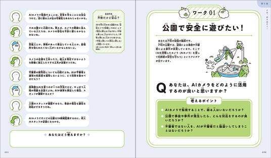 AIを活用してよりよい未来をつくるには、話し合いなどを通して多角的な視点から考えることが大切です。本書の第5章には、実際にAIの活用方法を考えるワークを用意しています。また、ダウンロード特典として授業で使えるワークシートが3枚ついています。クラスでのディスカッションや、実践的な学びの活動をサポートします。