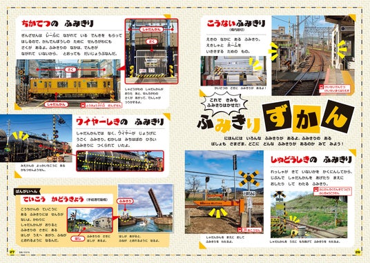 踏切の仕組みや作り方、さまざまな種類の踏切、踏切の渡り方やルールなど、楽しく学びながらたっぷり遊べる一冊です。