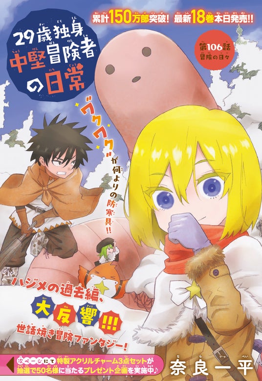 最新18巻が本日発売!これを記念して『29歳独身中堅冒険者の日常』がセンターカラーで登場しています。
