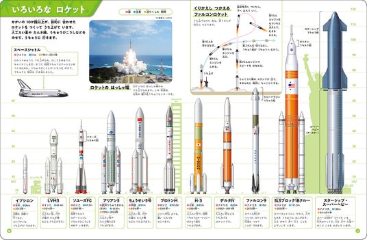 ▲世界各国のロケットが大集合のページも! 2024年に打ち上げが成功した日本の最新ロケットH3も登場。