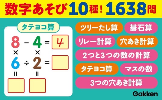 2つの数の計算、3つの数の計算、穴あき算、リレー計算、ツリー足し算、碁石計算など、学校の勉強とは異なる多彩な問題10種類を掲載しました。毎日飽きずに楽しく続けられます。