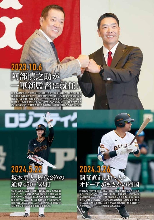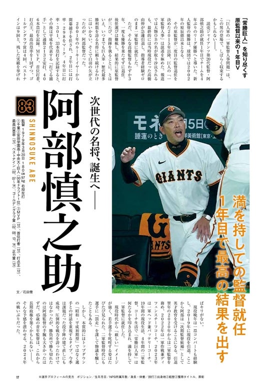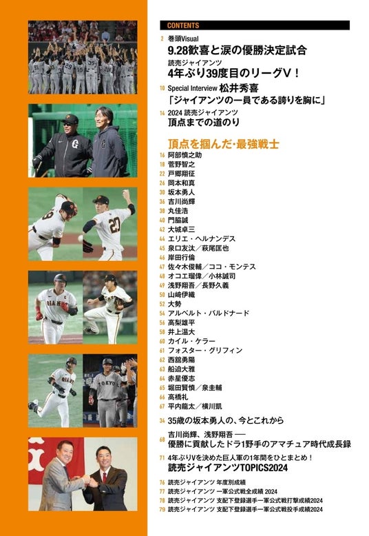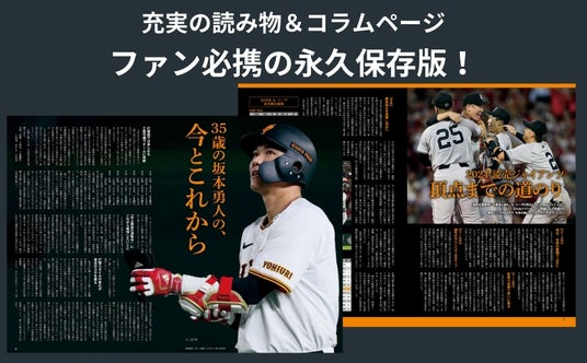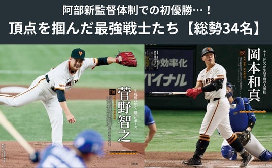 歓喜の胴上げシーンはもちろん、就任1年目でチームを優勝へと導いた阿部新監督の涙、今年の名場面も余すところなくオールカラーで掲載!