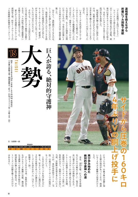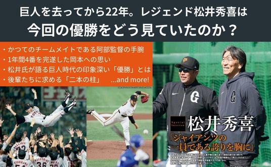 さらに、NYで巨人優勝の報を受けた、【松井秀喜氏への特別取材記事】を掲載しました。かつてのチームメイト阿部慎之助監督や後輩たちへの思い、自身の記憶に残る優勝について語ります。