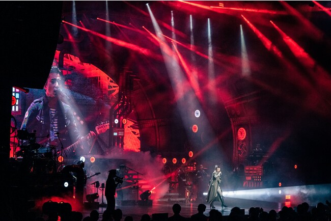 バンドメンバーによる美しいハーモニーが響き渡り、トレンチコート姿の彼女があらためてステージへ。グルーヴィーな「NIKE ~The goddess of victory」からアルバム『ダイアモンドダストが消えぬまに』収録の「LATE SUMMER LAKE」へ。アップテンポなナンバーに特効の演出が加わり、哀しみを振り払う。