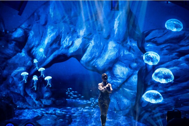 会場の灯りが落とされ、最新アルバムのジャケットにも登場する潜水士のひとりが、深海に静かに沈みゆく映像が映し出される。誰もがかたずをのんで見守る中、キーボードによる荘厳な調べが奏でられ、ナポレオンジャケットとマントをまとった彼女が登場する。