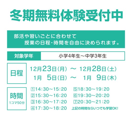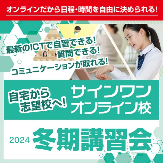 株式会社 学研ホールディングス(東京・品川/代表取締役社長:宮原博昭)のグループ会社、株式会社 学研スタディエ(さいたま市/代表取締役社長:亀谷眞宏)の展開する、進学塾サインワンオンライン校では、2024年12月23日(月)から2025年1月9日(木)までの期間で、冬期講習会を開催いたします。