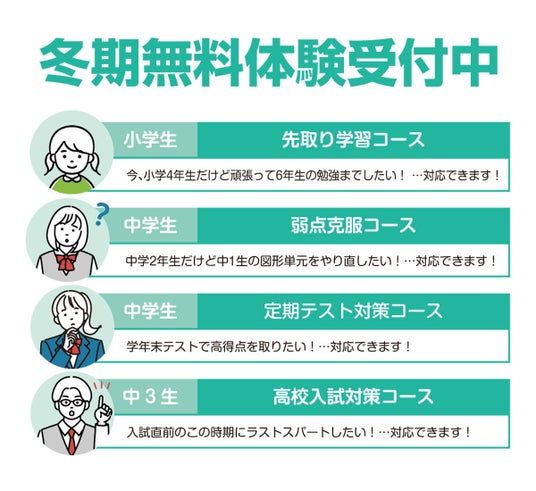 「ウチの子、オンラインで大丈夫かしら?」という心配をお持ちの方もいらっしゃると思います。そのような疑問やお悩みを解決するために、無料体験も実施しております。ぜひサインワンオンライン校の冬期講習会を無料で体験してみてください。実際の授業を体験してみることで、良さを実感していただければと思っています!