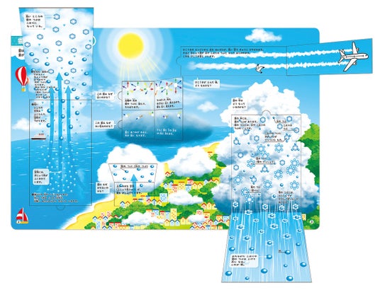 しかけをめくると、雲や台風の中をのぞけたり、雨が降ったり、虹がかかったり。