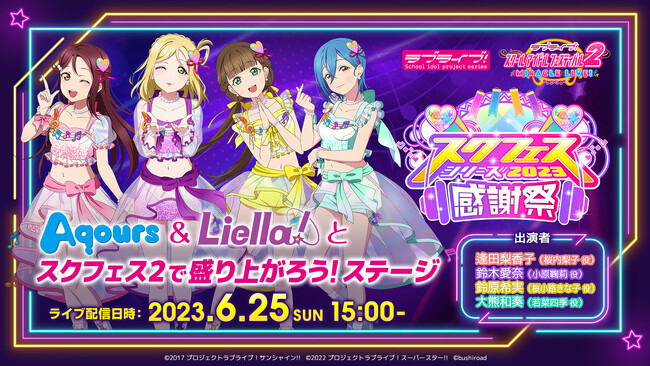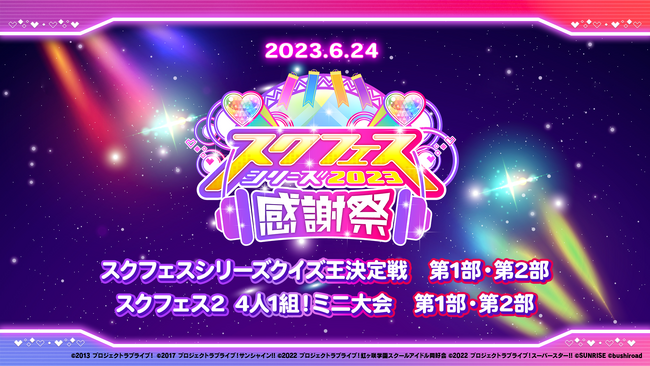 株式会社ブシロード(本社:東京都中野区、代表取締役社長:木谷高明)は、スマートフォン向けアプリ「ラブライブ!スクールアイドルフェスティバル2 MIRACLE LIVE!」(以下、スクフェス2)、株式会社バンダイナムコフィルムワークス(本社:東京都杉並区、代表取締役社長:浅沼誠)と共同開発いたしましたスマートフォン向けアプリ『ラブライブ!スクールアイドルフェスティバル ALL STARS』(以下、スクスタ)のリアルイベント「スクフェスシリーズ感謝祭2023」のステージが明日から開催いたしますので、お知らせいたします。