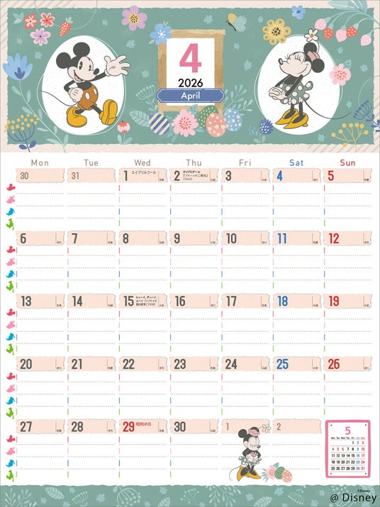 かわいいミッキー&ミニーや『おしゃれキャット』・マリー、美しいプリンセスたち、『くまのプーさん』、『バンビ』、『わんわん物語』など大好きなキャラクターたちが一年を通してあなたのお部屋を飾ります。