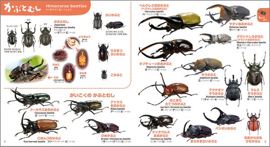 ▲むしの写真が散りばめられた紙面は、まるでおもちゃ箱みたい! 大好きなむしのことだから、たくさんの言葉をどんどん覚えられます。