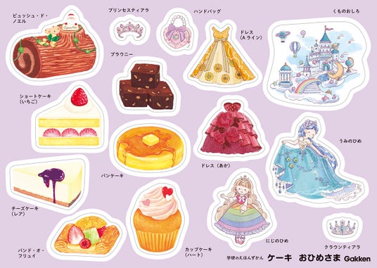 『ケーキのずかん』と『おひめさまのずかん』の2冊から厳選した、イラストシール1シート15枚付き! このギフトセットだけの限定シールです。