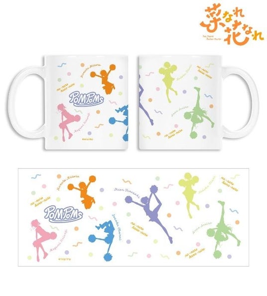 美空 かなた、小父内 涼葉、杏那・アヴェイロ、大谷 穏花、谷崎 詩音、海音寺 恵深のシルエット、キャラクターの名前、PoMPoMsのロゴモチーフ、作品名をPOPに散らしたマグカップに仕上げました。