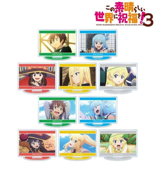 カズマ、アクア、めぐみん、ダクネス、アイリスの印象的なシーンをアクリルスタンドに仕上げました。