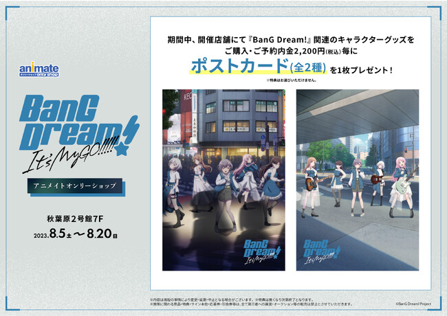期間中、開催店舗にて『BanG Dream!』関連のキャラクターグッズをご購入・ご予約内金2,200円(税込)毎に ポストカード(全2種) を1枚プレゼント!